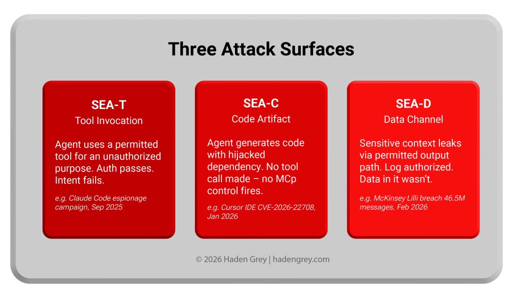 All three share the defining SEA characteristic: legitimate credentials, valid requests, unauthorized outcomes.